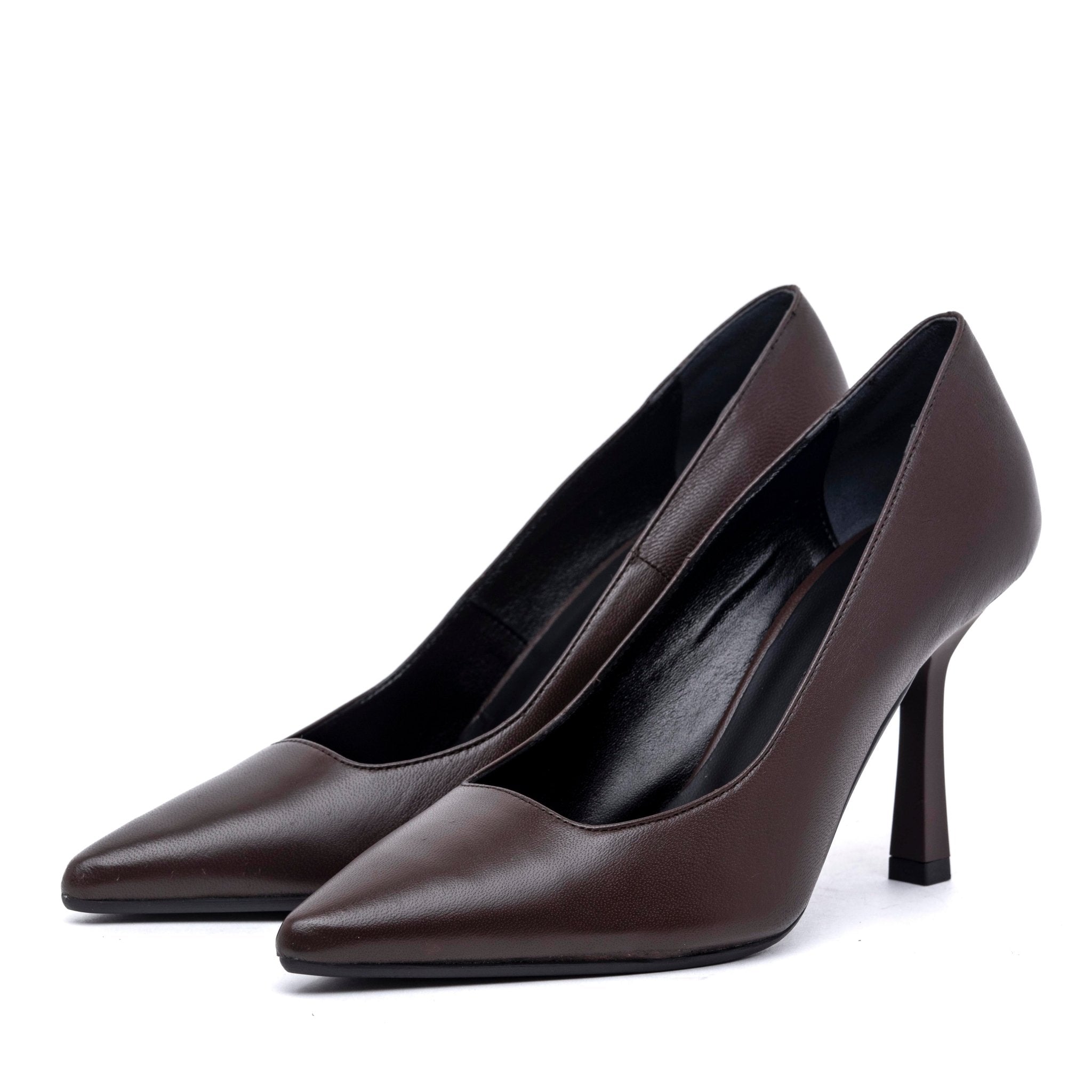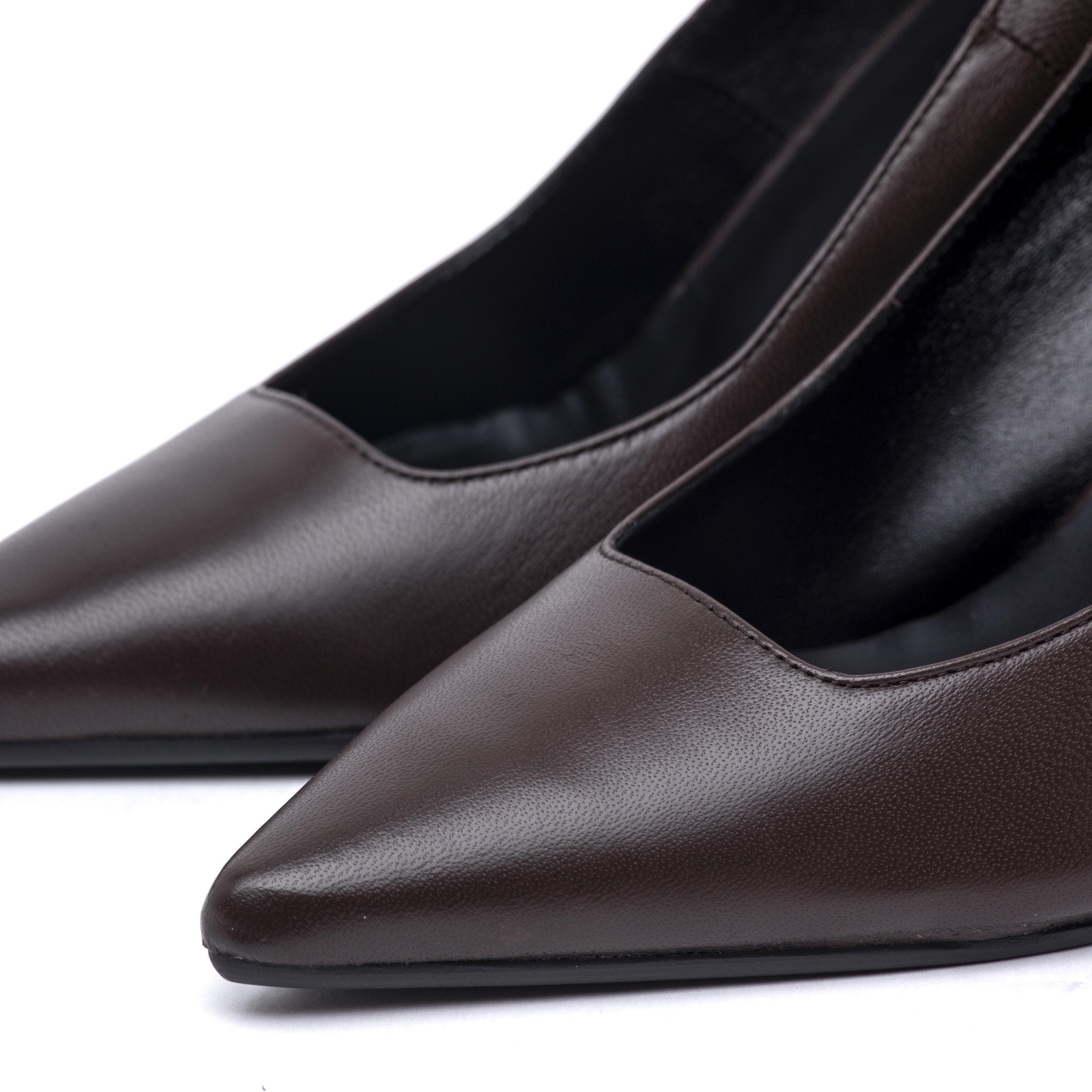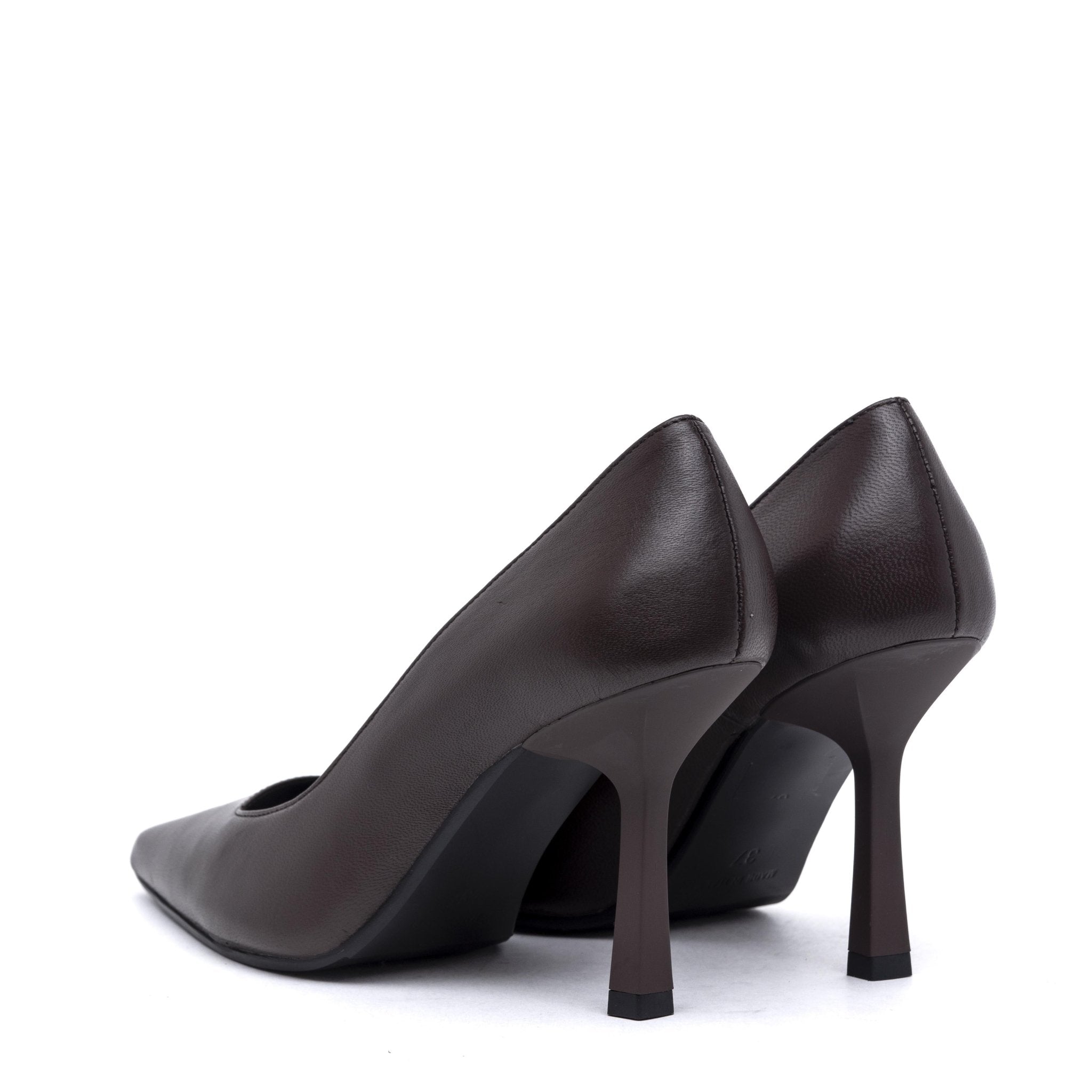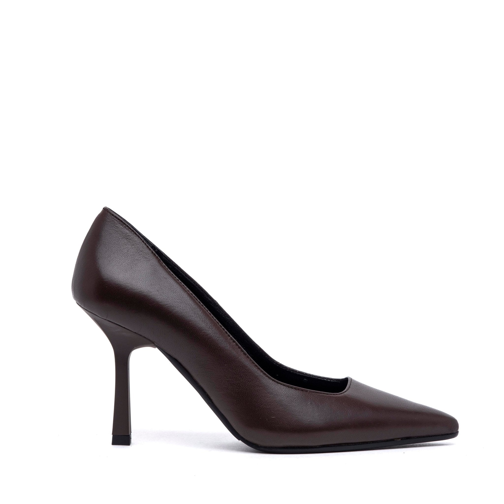Décolleté in pelle di vitello cioccolato con forma a punta.
