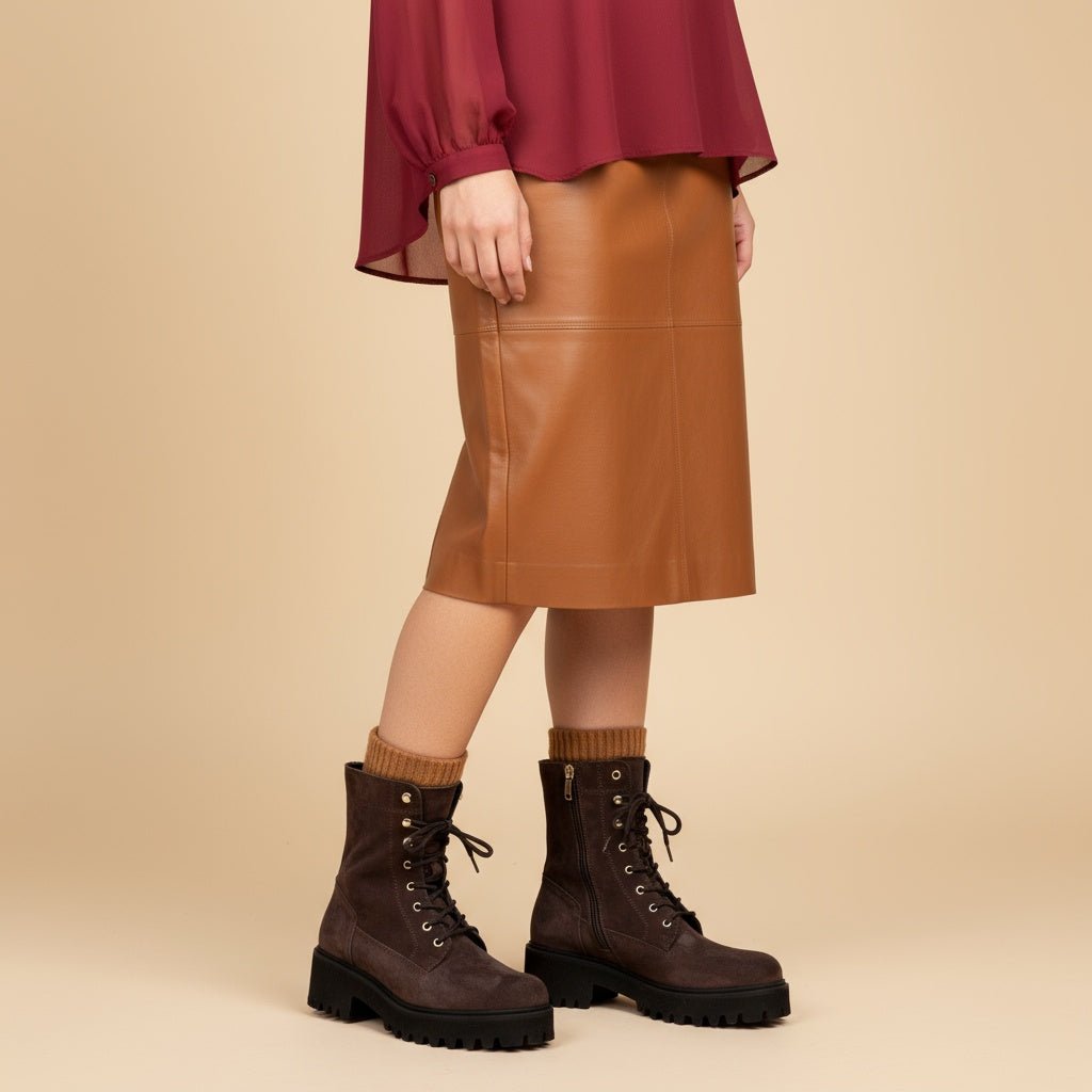 Stivaletto modello anfibio in pelle scamosciata marrone.