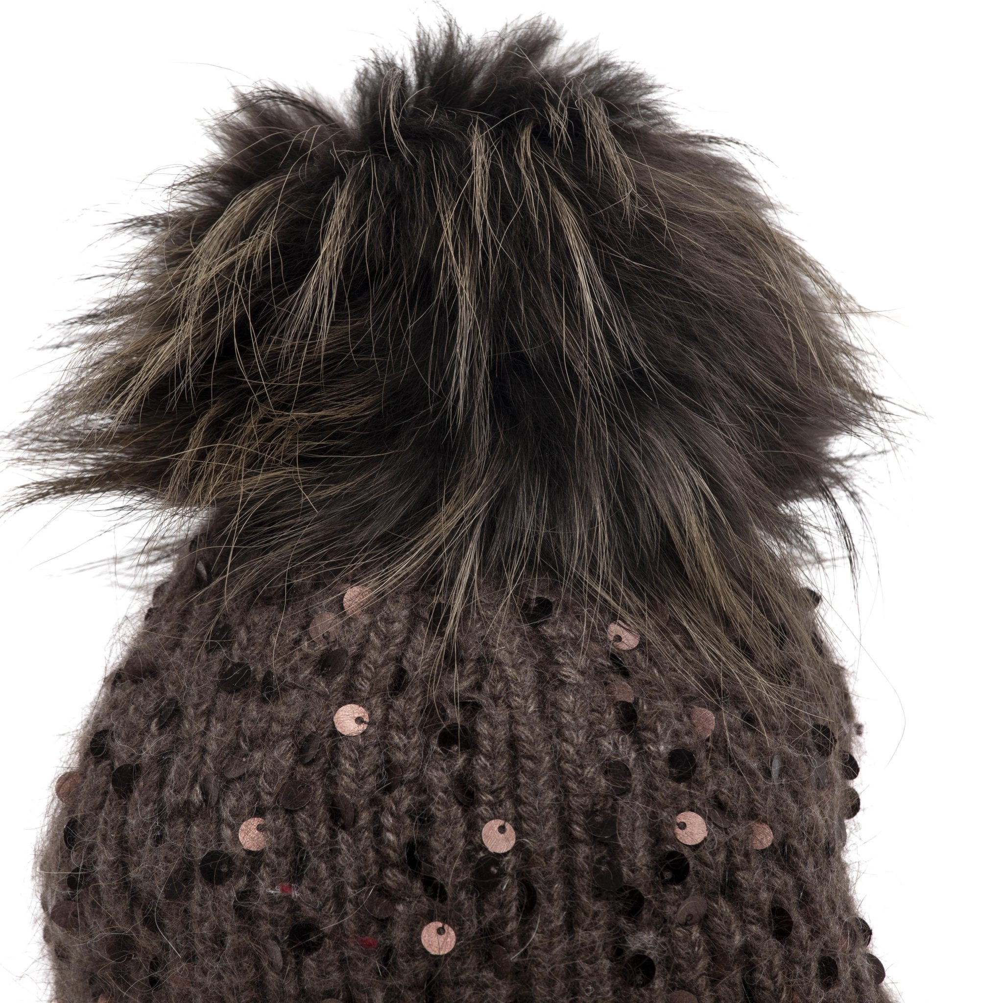Berretto color cioccolato con paillettes in tinta e pon-pon in eco pelliccia.