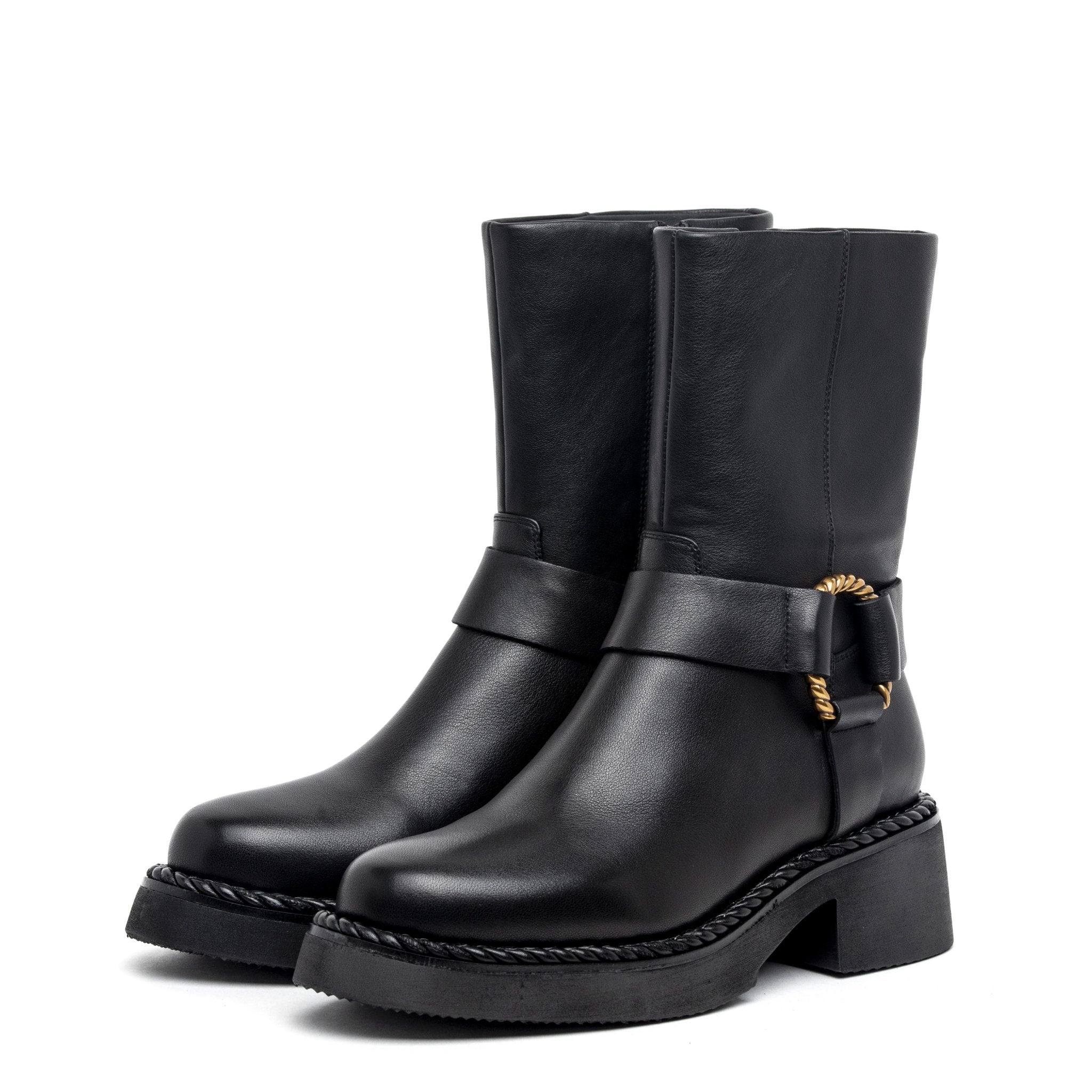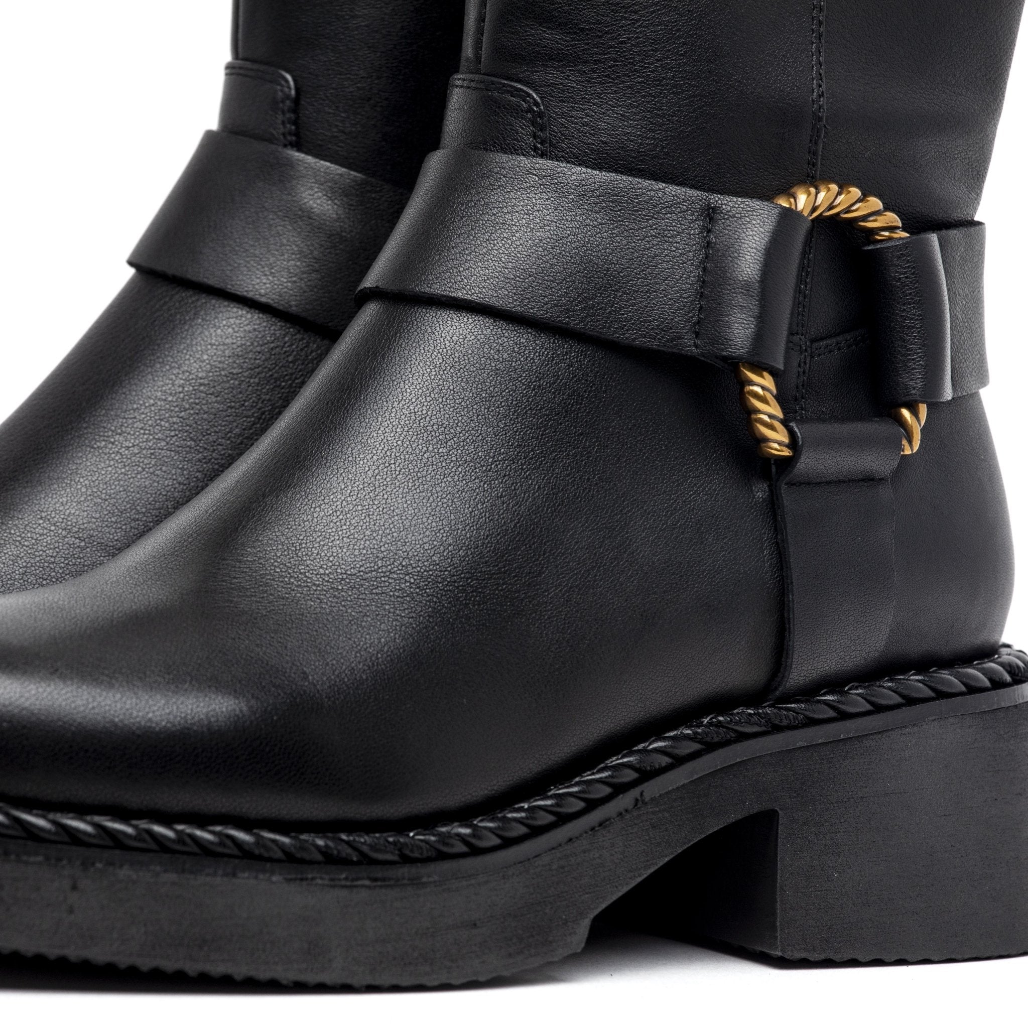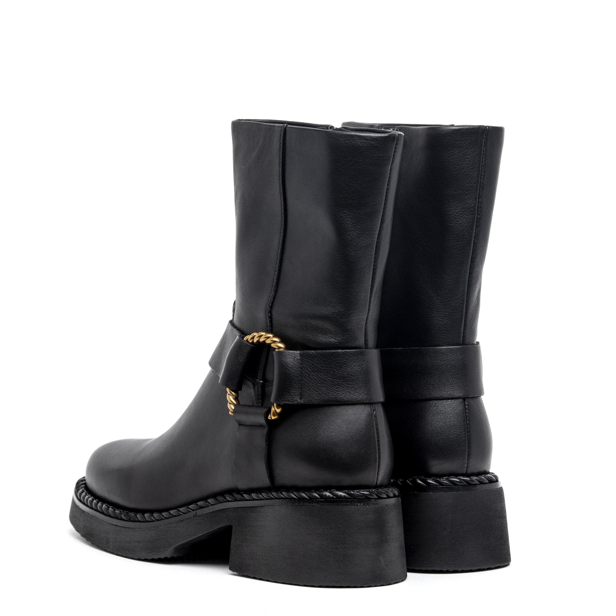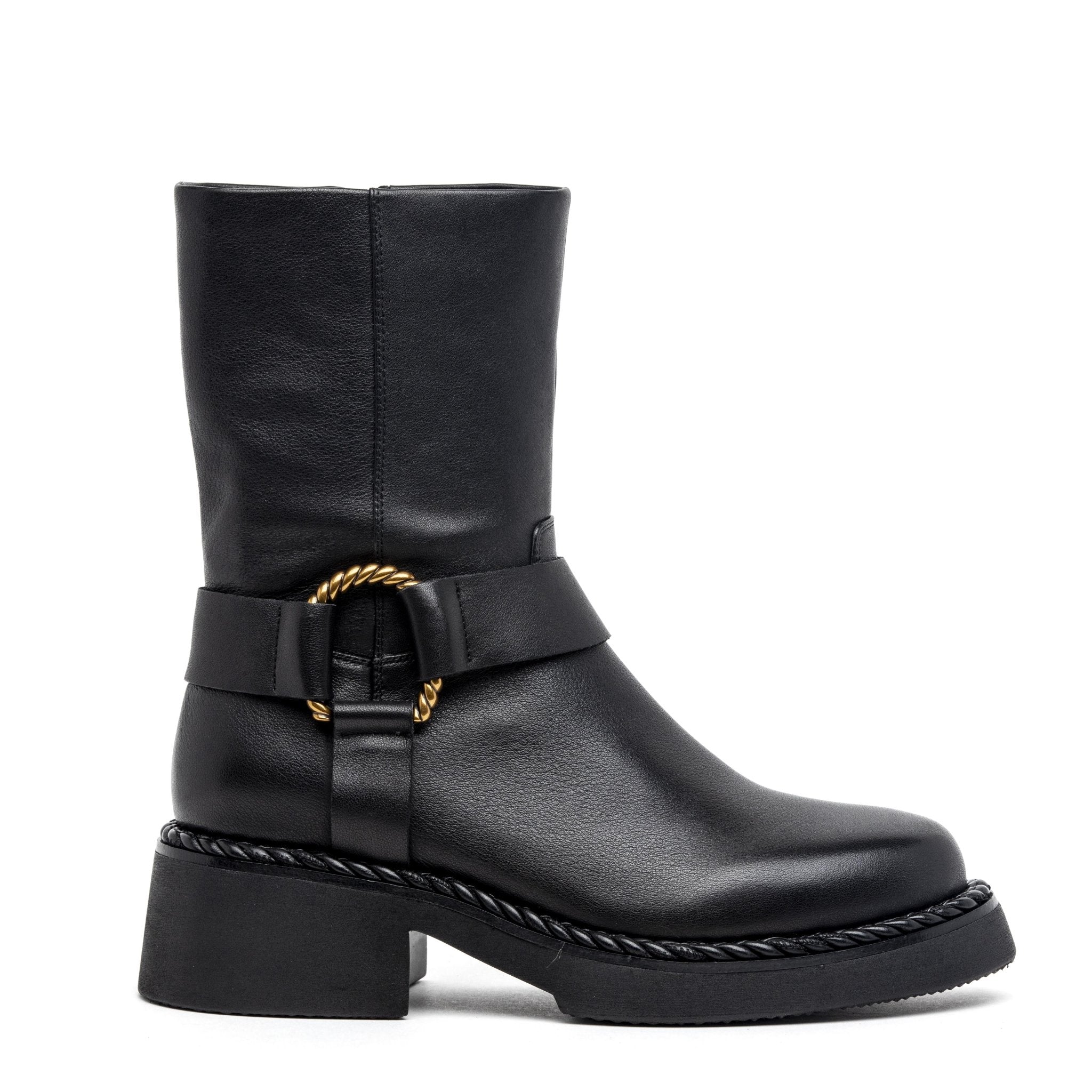 Stivaletto biker in pelle di vitello nera con accessorio.