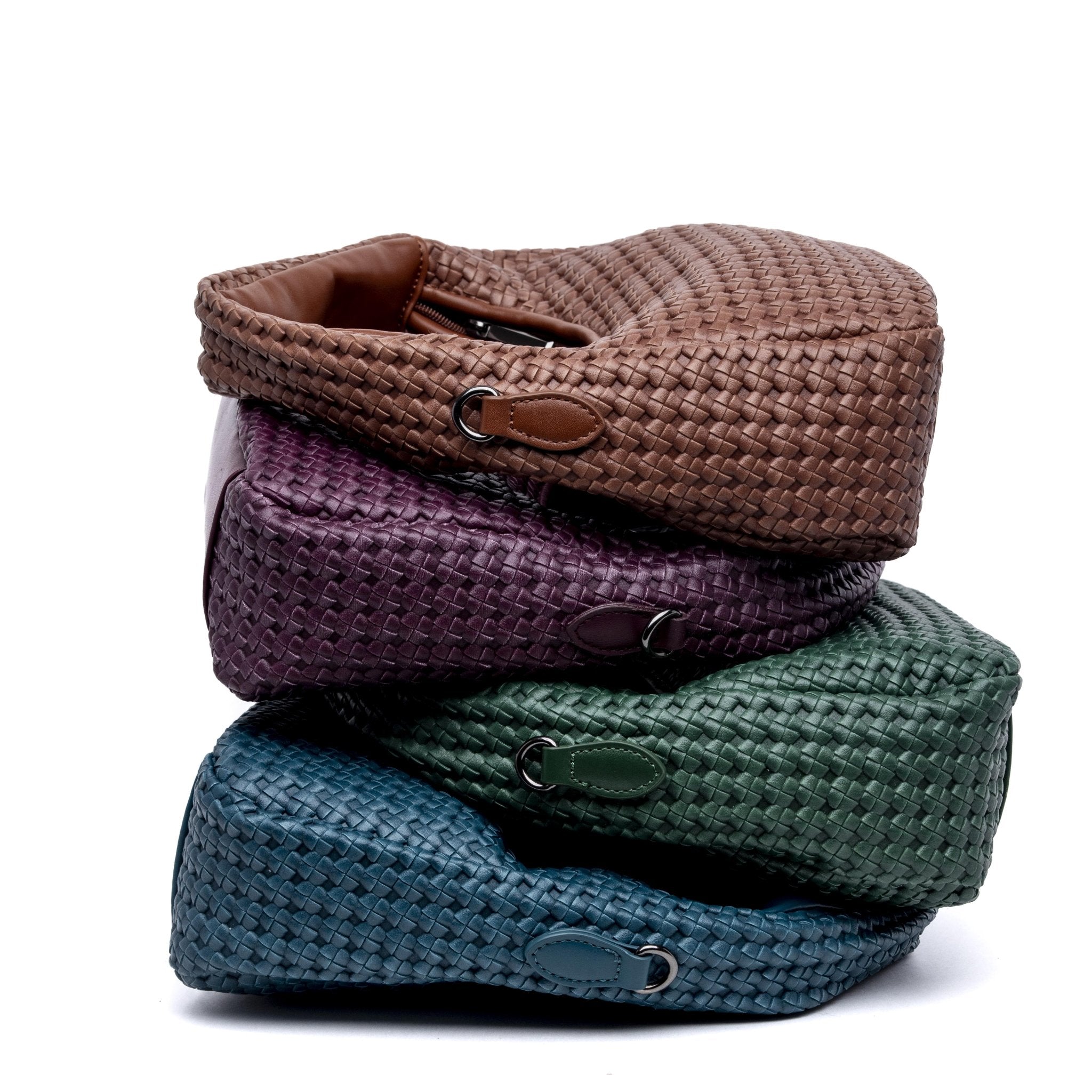 Borsa a mano in ecopelle color verde petrolio con effetto intrecciato. Chiusura con cerniera a scomparsa e tracolla lunga interna in dotazione.