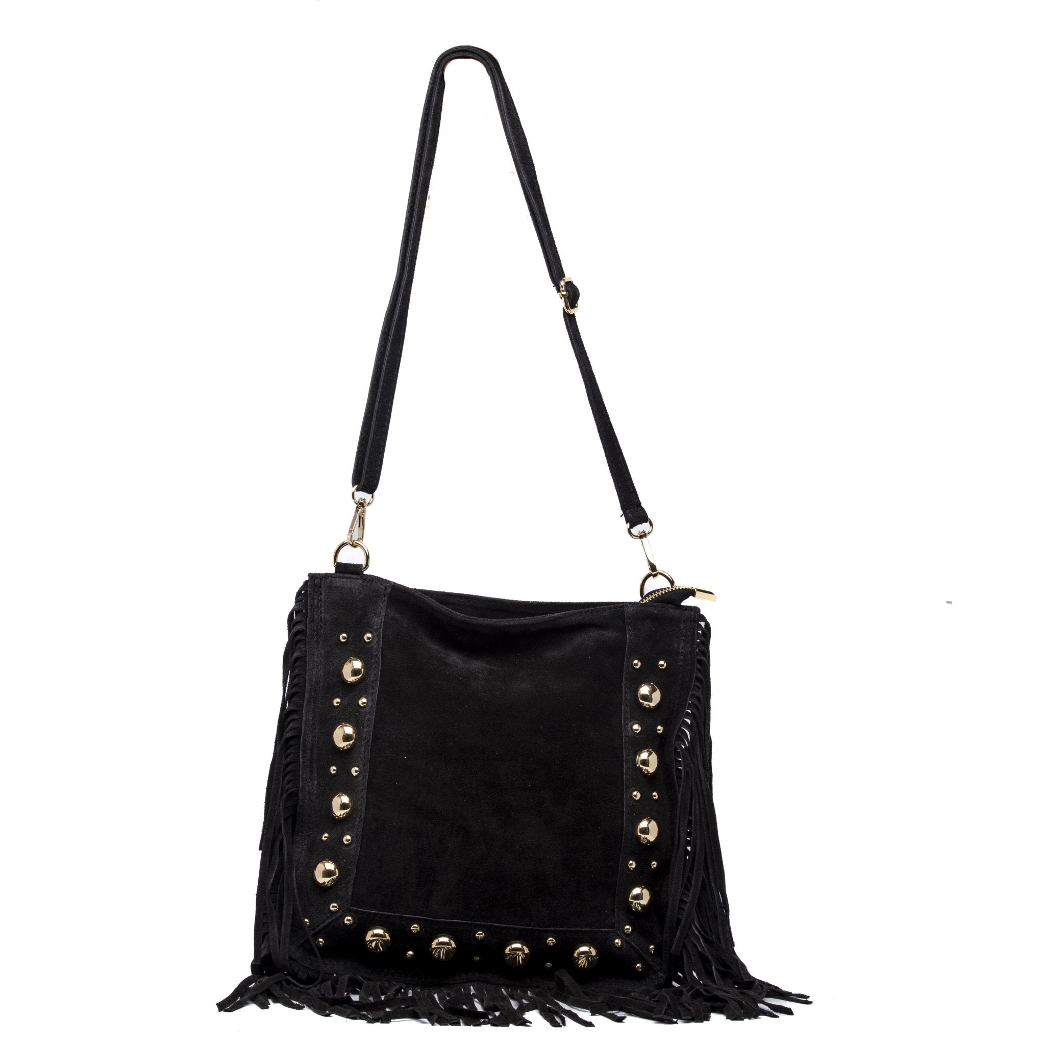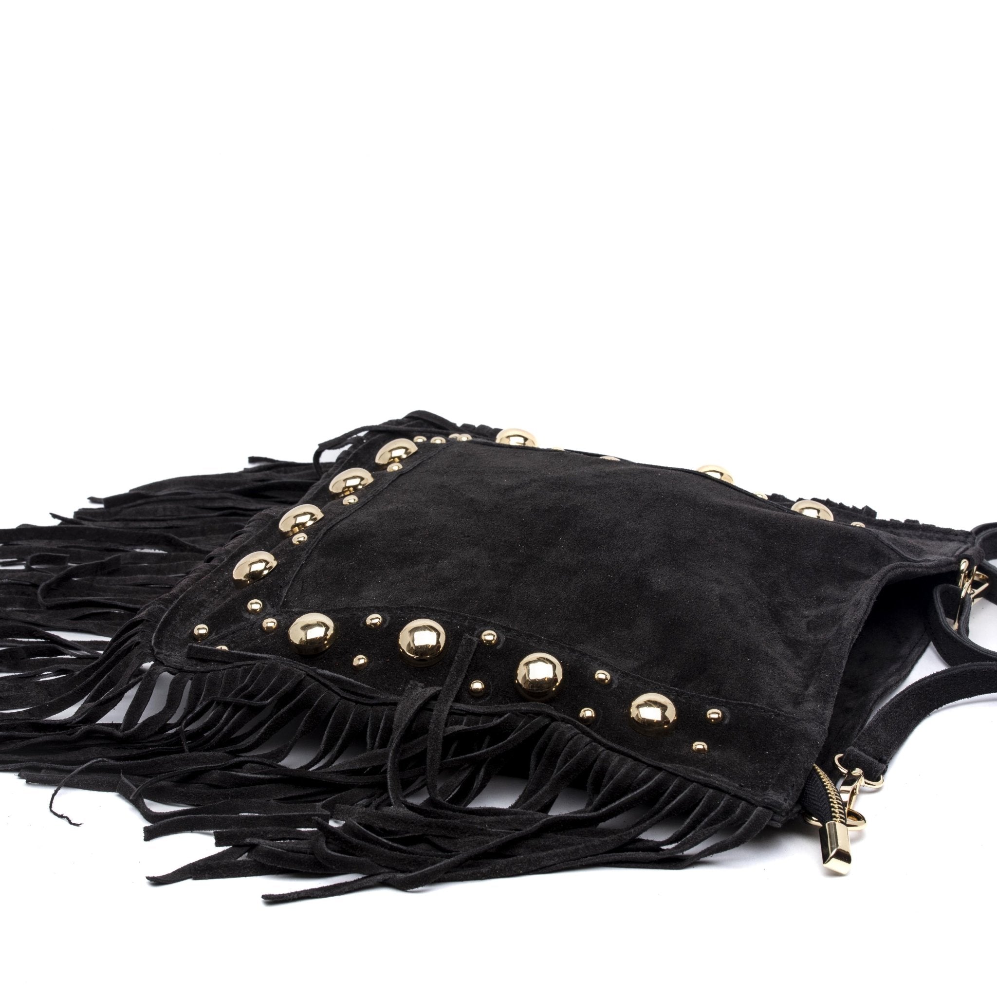 Borsa a spalla in morbida pelle scamosciata colore nero e frange. Profilo decorato con borchie dorate a sfera. La borsa può essere comodamente portata a spalla grazie alla tracolla in pelle scamosciata regolabile. Chiusura con cerniera.
