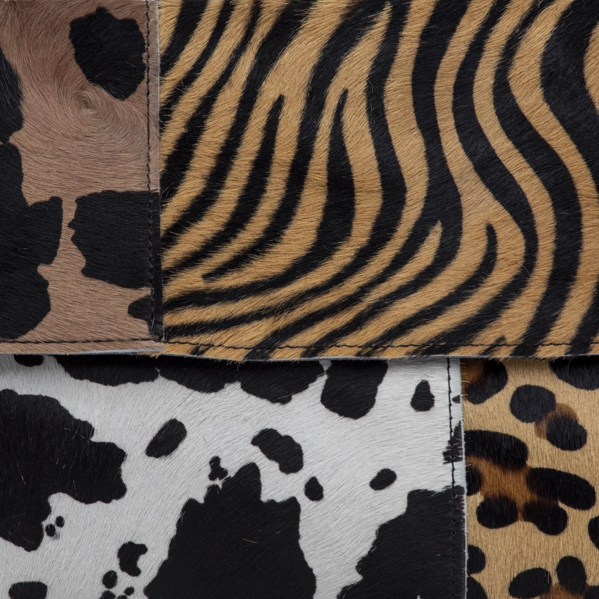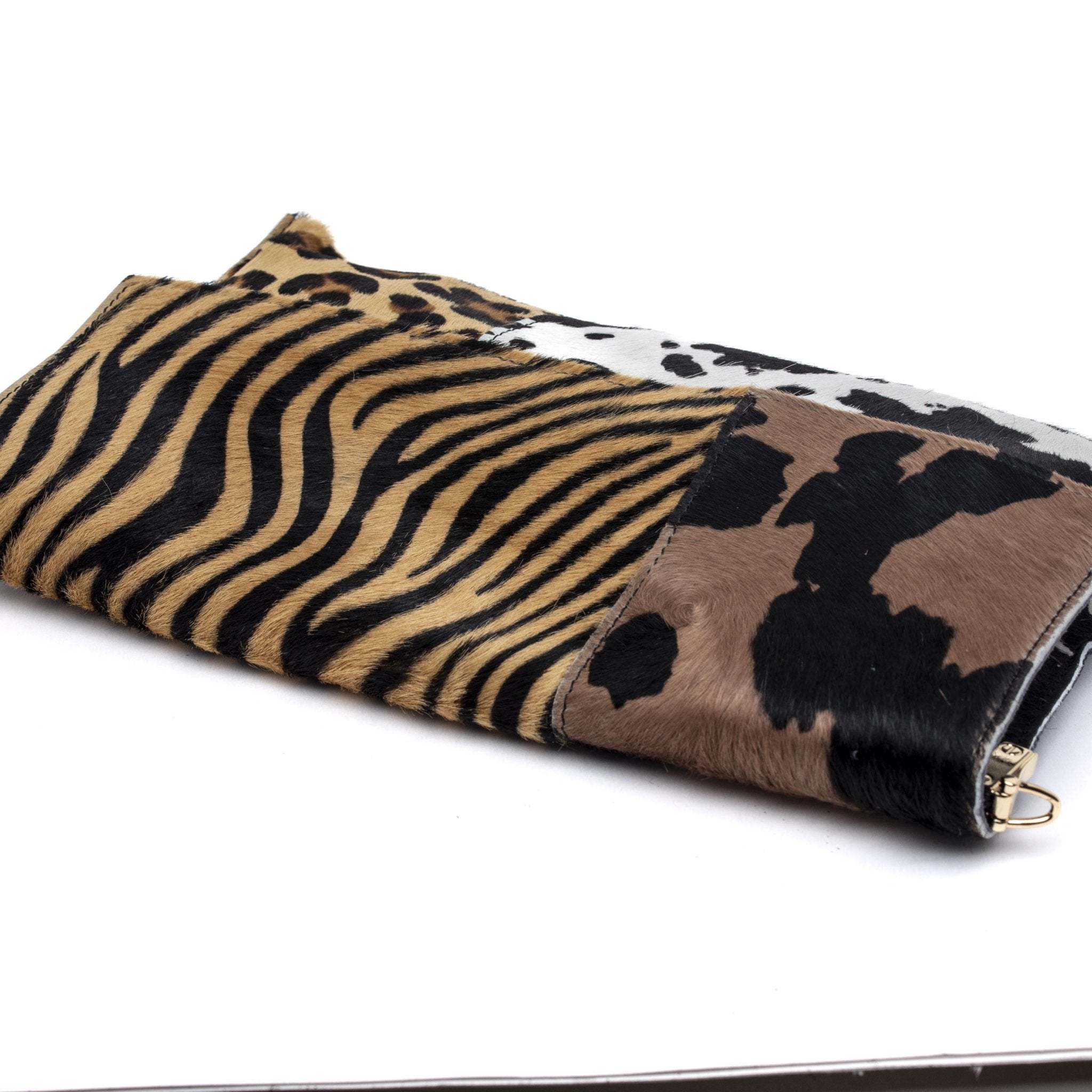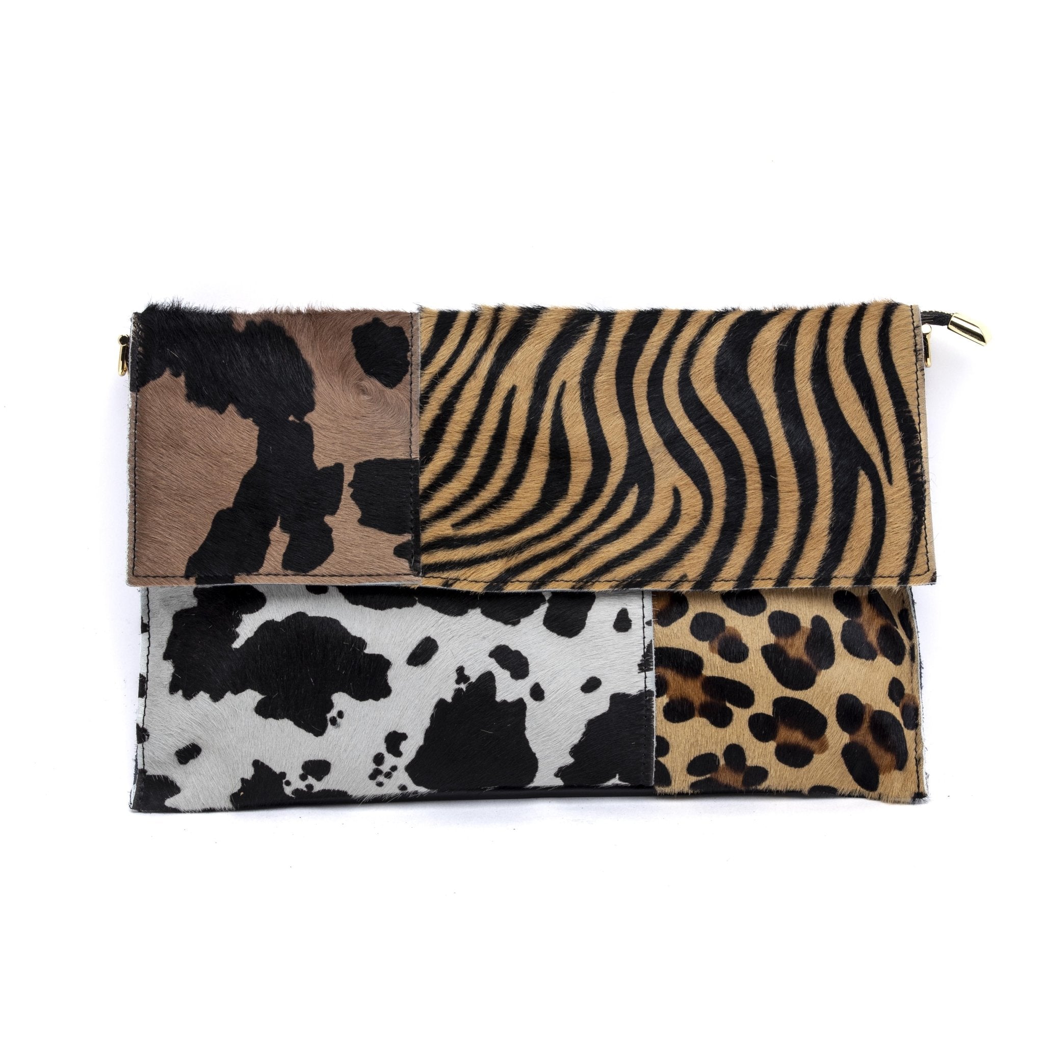 Da ritagli di pelle di cavallino i maestri artigiani fiorentino hanno ricavato un capolavoro di borsa. Utilizzando cavallino con stampe maculate zebrate e muccate cucite quasi a caso il risultato è una borsa mai uguale a se stessa, Non ne esistono infatti due pezzi uguali. Chiusura con cerniera e tracolla lunga in dotazione.