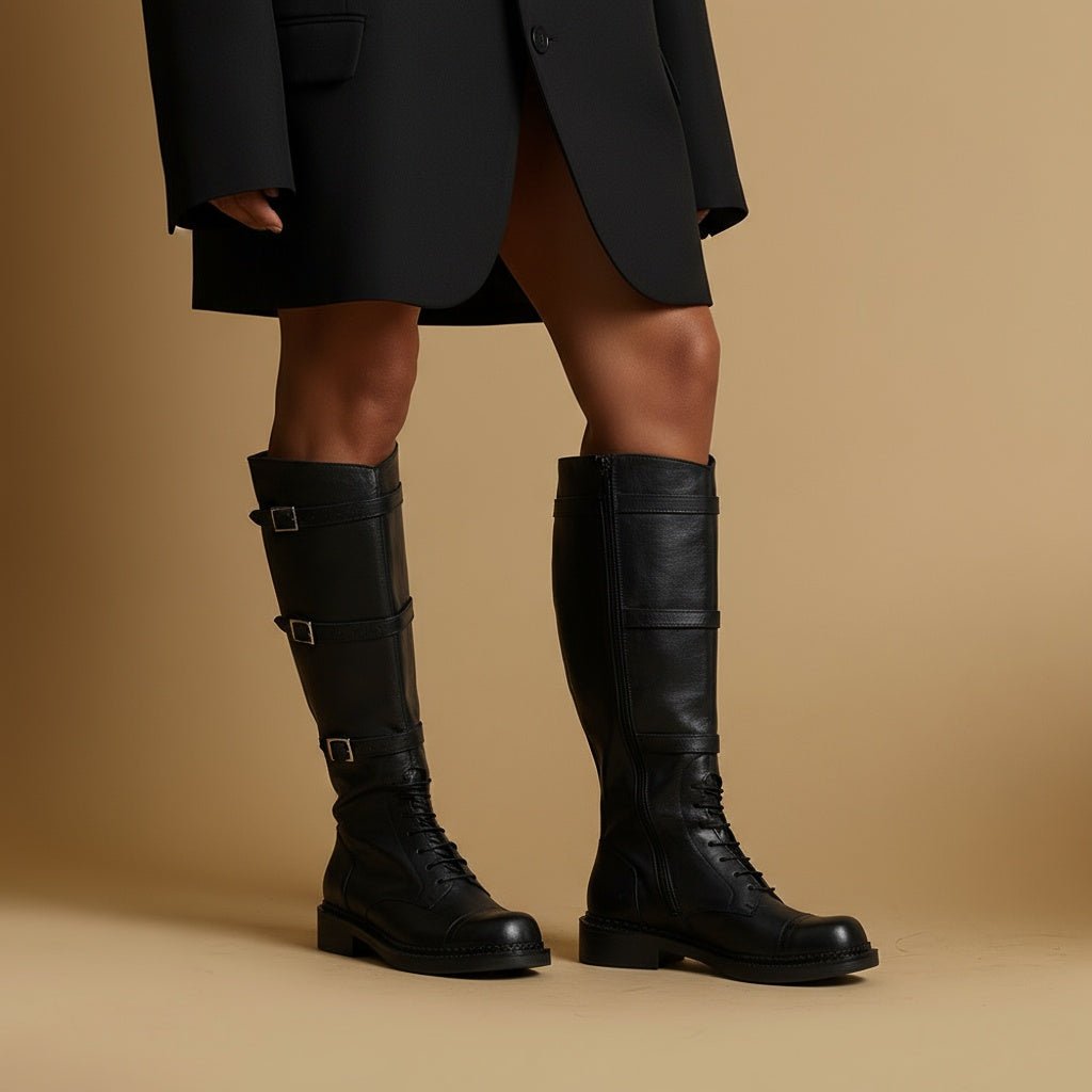 Stivale alto in vitello nero con fibbie.