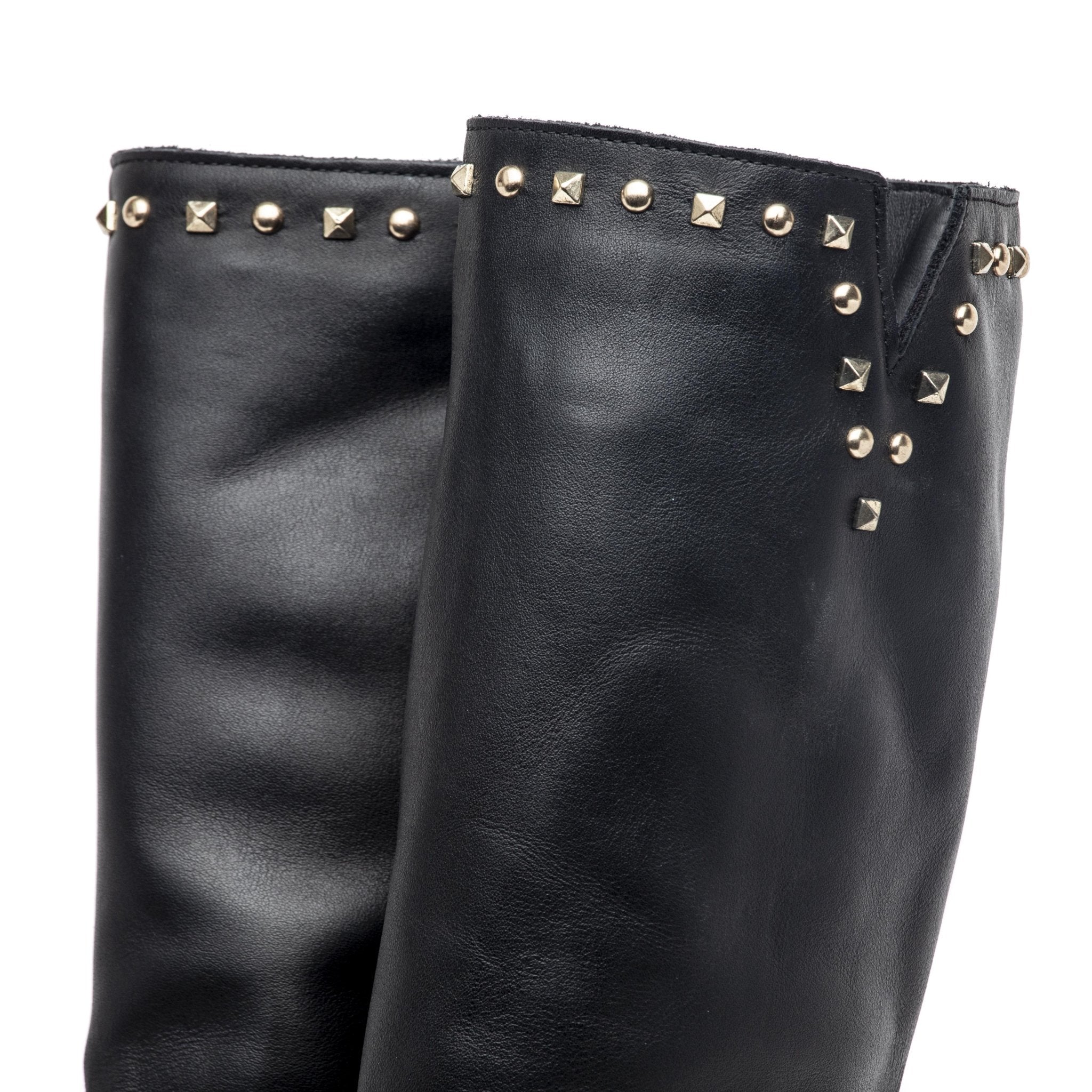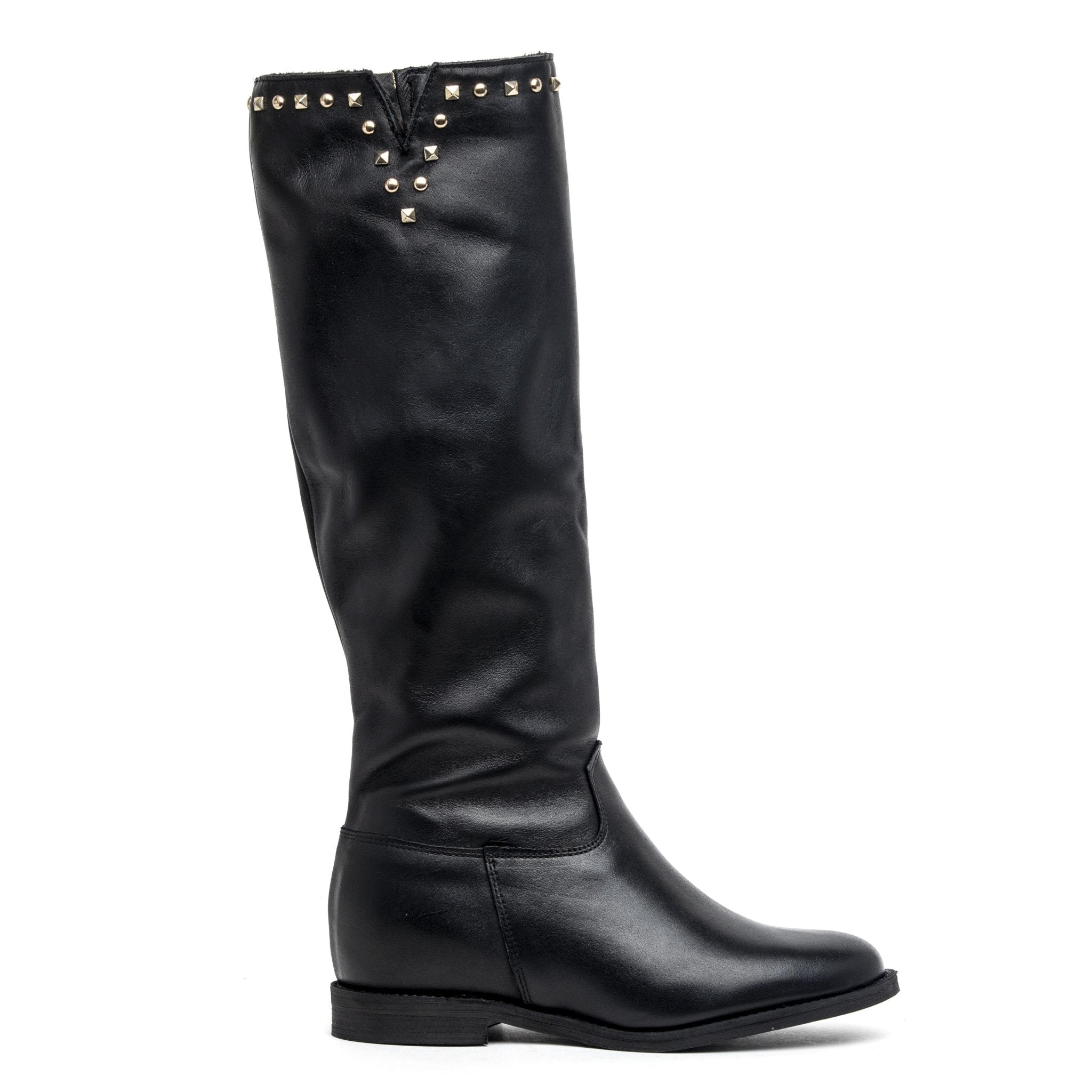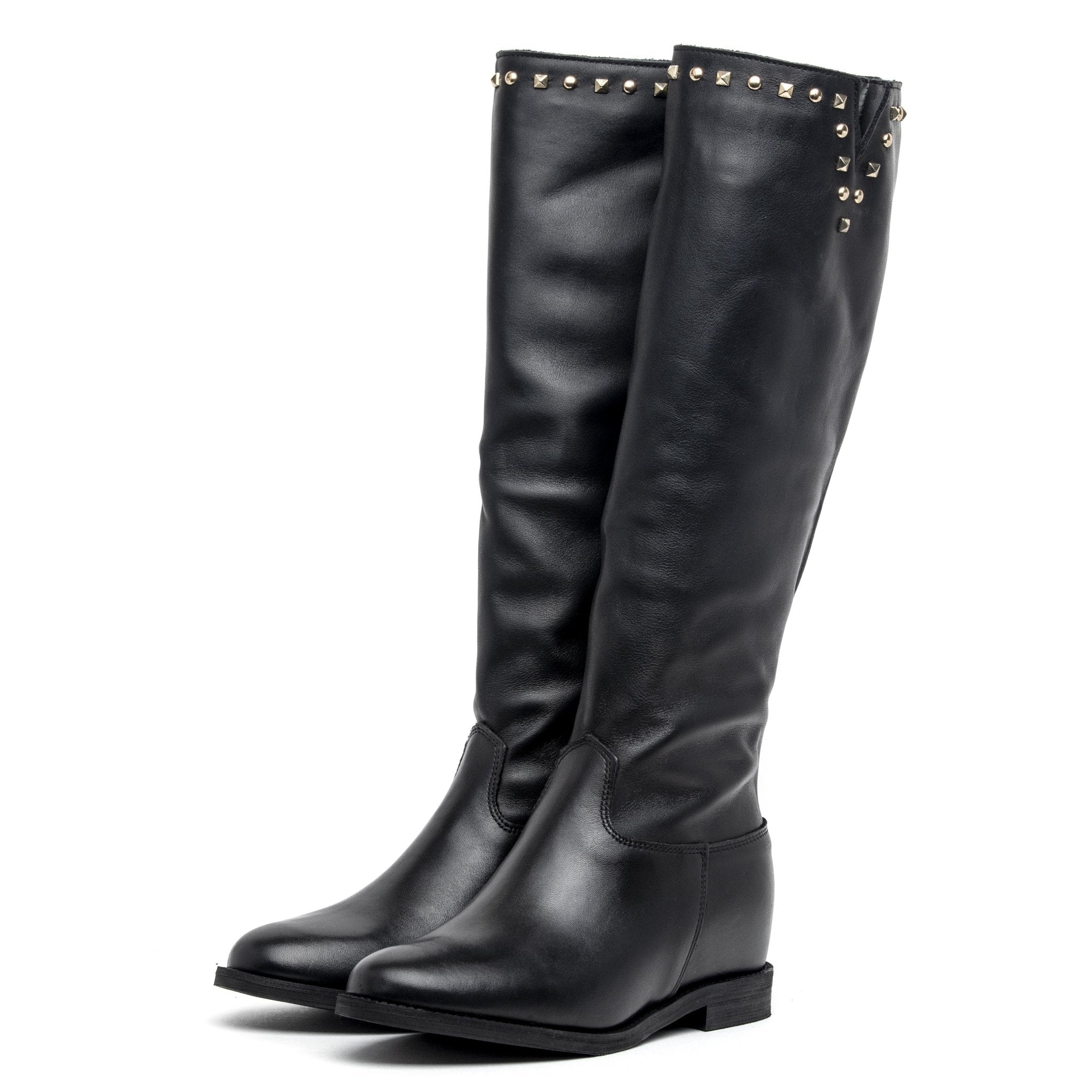 La comodità di una zeppa interna rialzata e la grinta dello stivale borchiato.