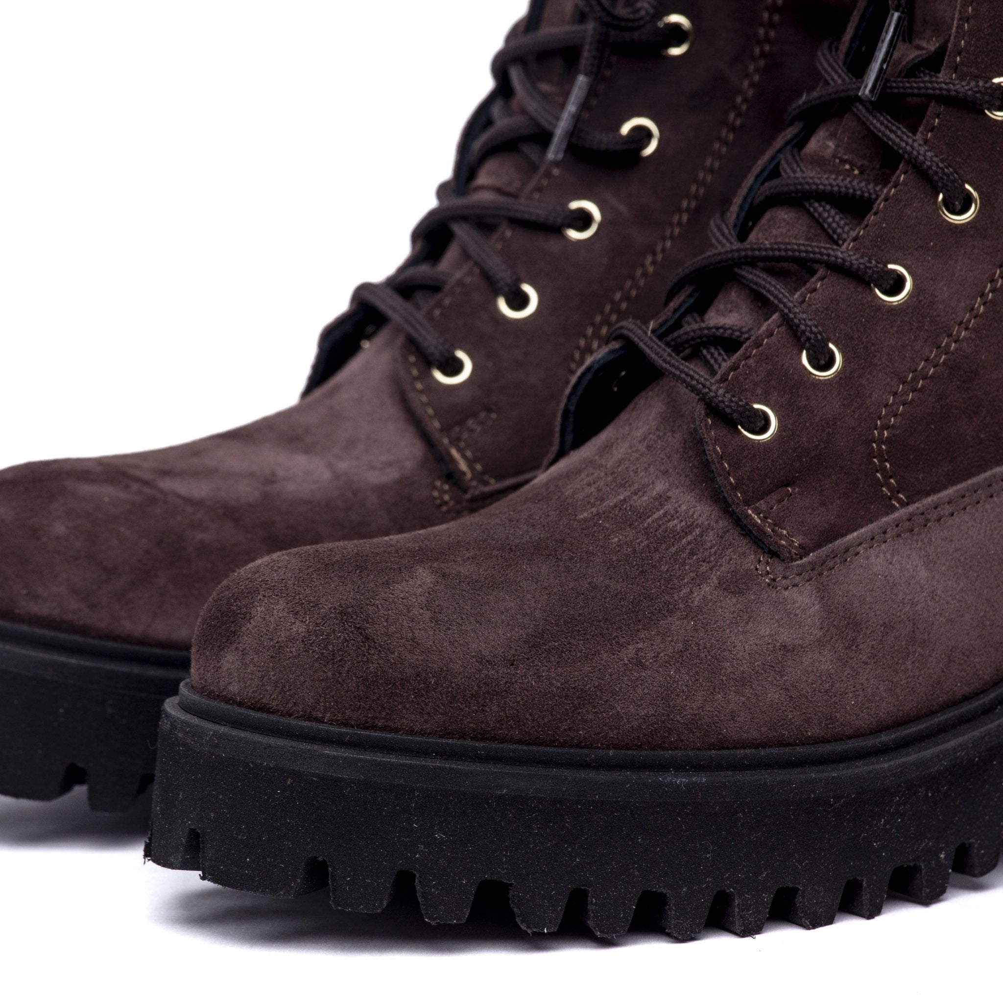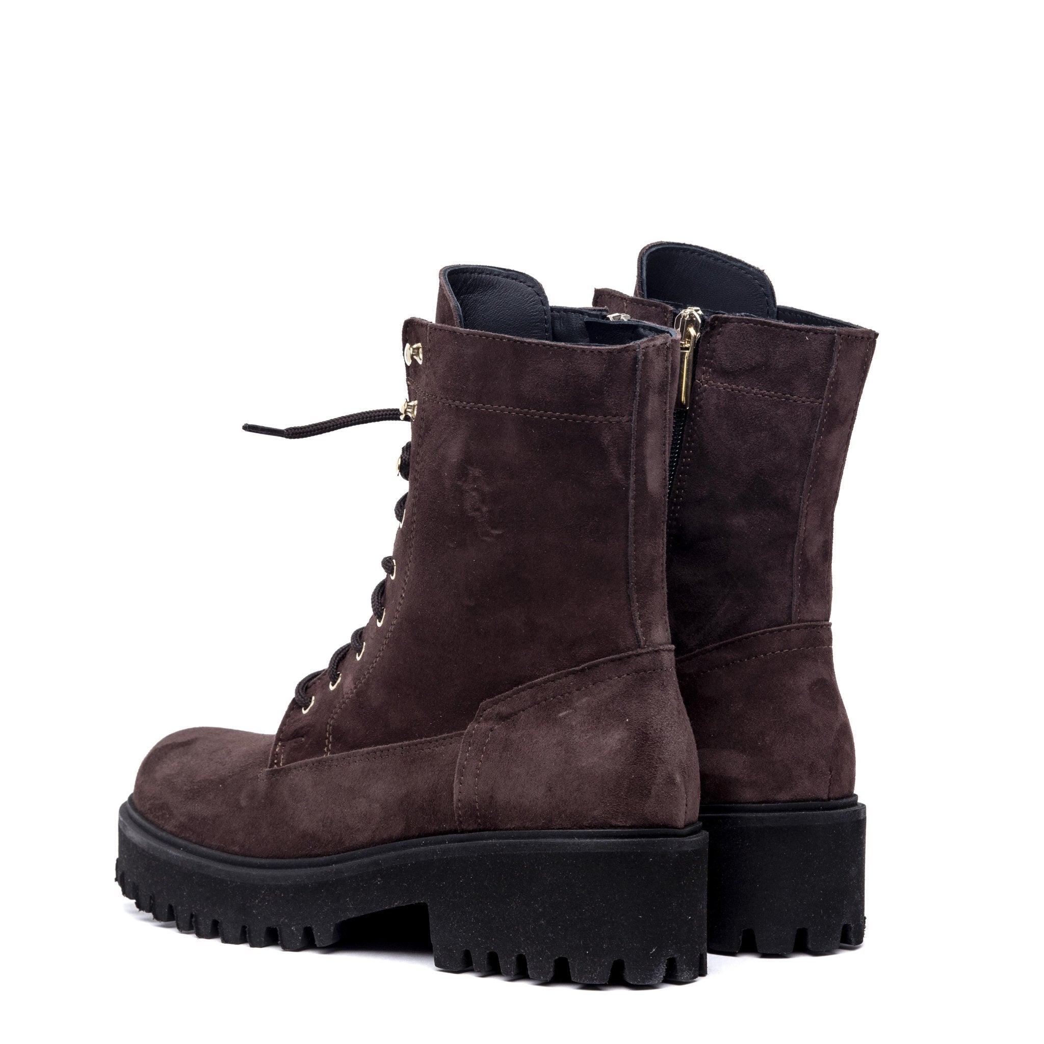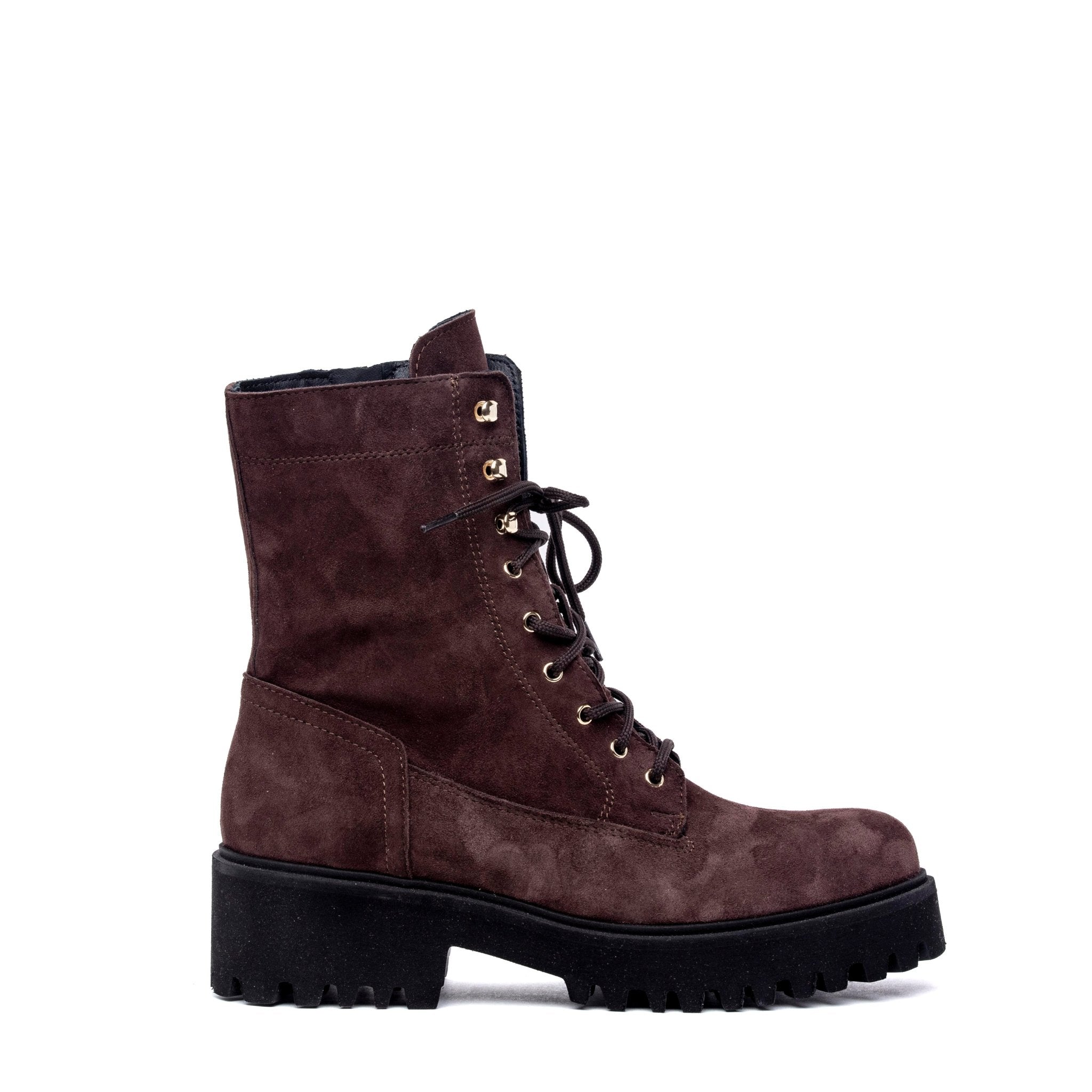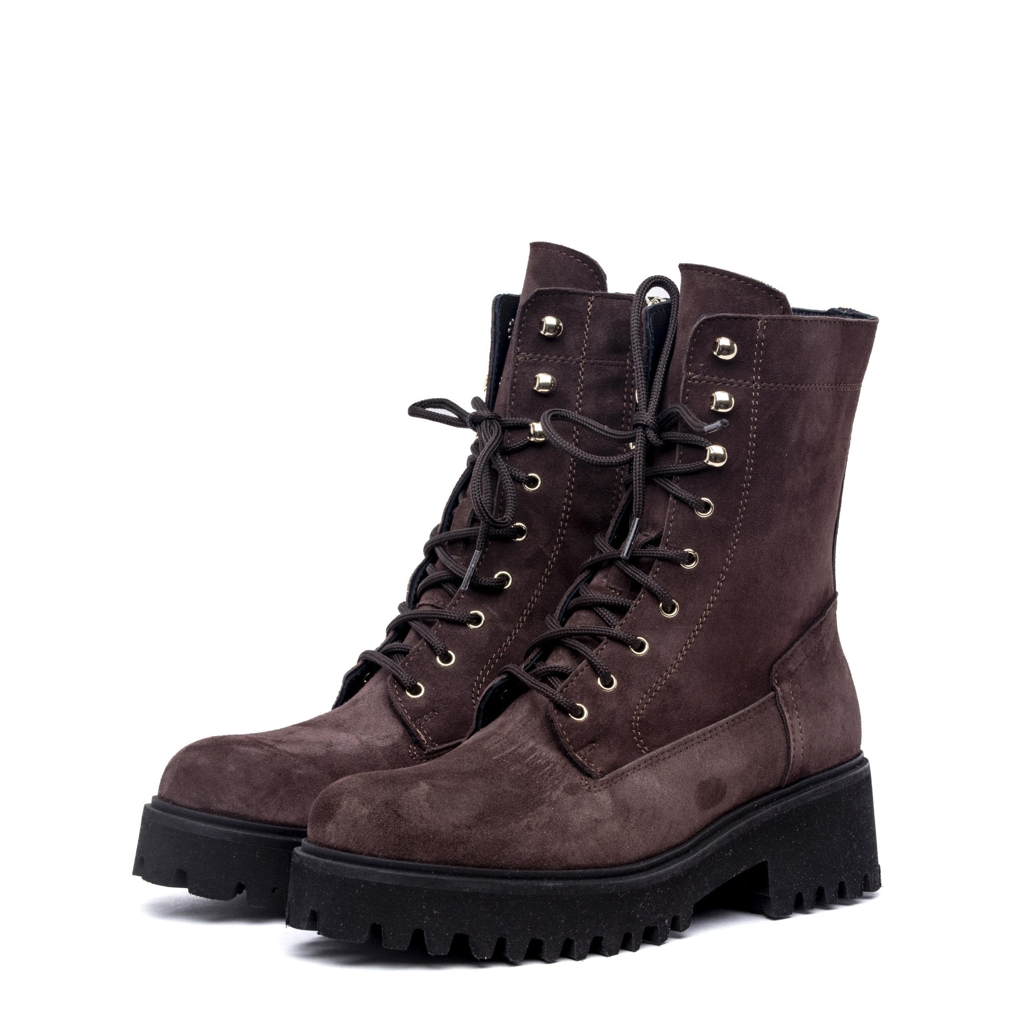 Stivaletto modello anfibio in pelle scamosciata marrone.